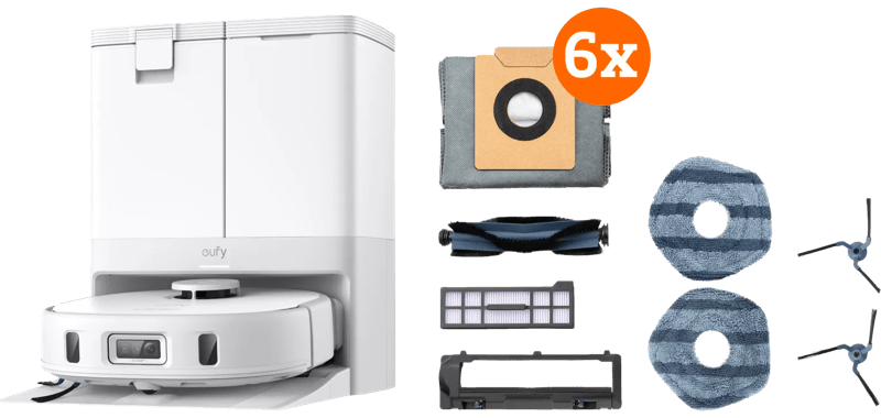 Met de eufy X10 Pro Omni White Complete haal je een handige schoonmaakhulp inclusief onderhoudspakket voor één jaar in huis. Zo denk je later niet na over het bijkopen van bijvoorbeeld de stofzakken of dweilpads voor je robot. Dankzij het uitgebreide basisstation maakt de robotstofzuiger zelfstandig schoon. Hij leegt namelijk zijn stofbak automatisch en vult ook zijn watertank. Daarnaast wast en droogt hij zijn dweilpads. Dankzij de ronddraaiende dweilpads maakt de robot grondig schoon. Hij verwijdert niet alleen fijnstof, maar ook vlekken van je vloer. Stof en haren zuigt hij op met een zuigkracht van 8.000 Pascal. De robot slaat geen plekken over, omdat hij lasernavigatie gebruikt. Dankzij verschillende sensoren en kunstmatige intelligentie herkent hij ook objecten. Zo loopt de robot niet vast op rondslingerende spullen. (EAN: 6151120551546)