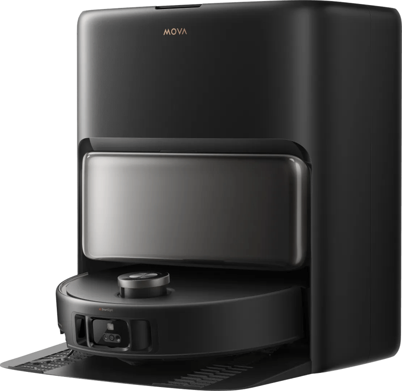 De Mova V50 Ultra Complete Black maakt krachtig en hygiënisch schoon. De robotstofzuiger dweilt je vloer met warm water van 50 graden Celsius, waardoor vetvlekken en vuil makkelijk loslaten. Het reinigingsstation wast de dweilpads met 80 graden Celsius heet water, droogt ze met 60 graden Celsius hete lucht en gebruikt uv licht voor extra hygiëne. Ook leegt het station de stofbak, voegt schoonmaakmiddel toe en spoelt zichzelf schoon. Dankzij het inklapbare lasersysteem rijdt de robot onder lage meubels. Daarnaast rijdt hij over drempels tot 6 cm. Met 24.000 Pascal zuigkracht en een zijborstel die vuil uit hoeken haalt, blijft er geen stof liggen. Dankzij de camera met kunstmatige intelligentie, dubbele laser en led verlichting navigeert de robot heel precies, ook in het donker. (EAN: 6977728943800)